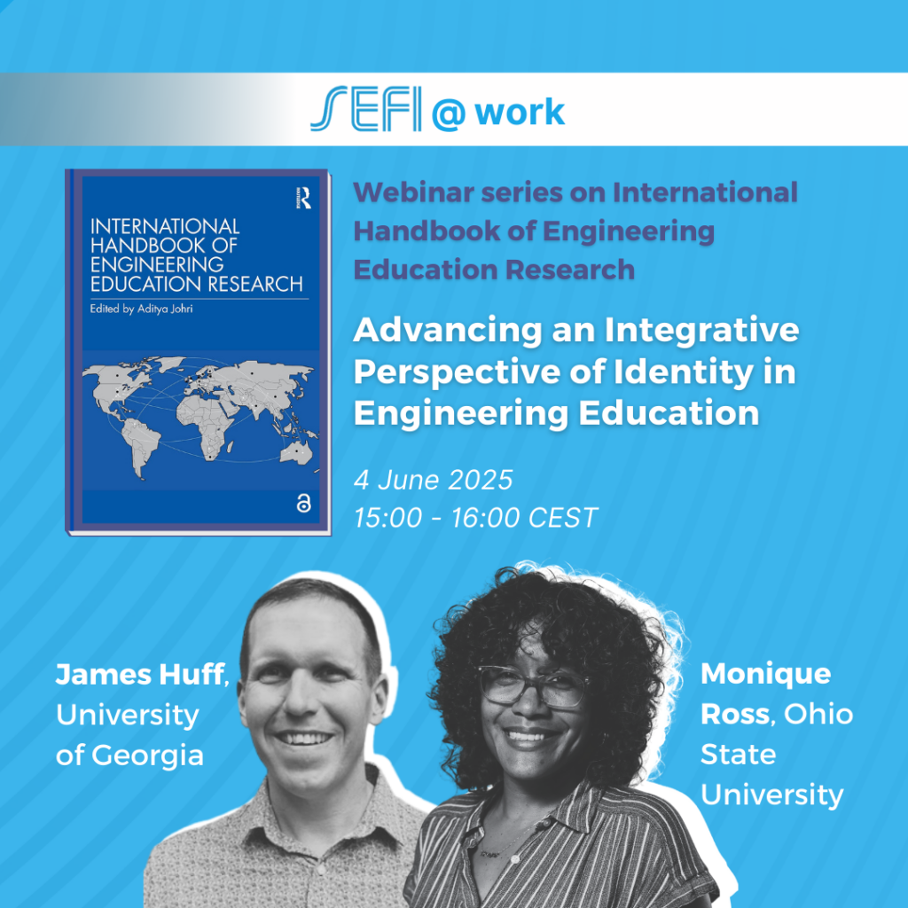 Join us for an insightful SEFI@work featuring James Huff (Associate Professor of Engineering Education; Engineering Education Transformations Institute, University of Georgia) and Monique Ross (Associate Professor and Director of the Center for Computing Education, Engineering Education; The Ohio State University) who will share their research on the role of identity in engineering education, as detailed in chapter 9 “Advancing an Integrative Perspective of Identity in Engineering Education” from the International Handbook of Engineering Education Research.